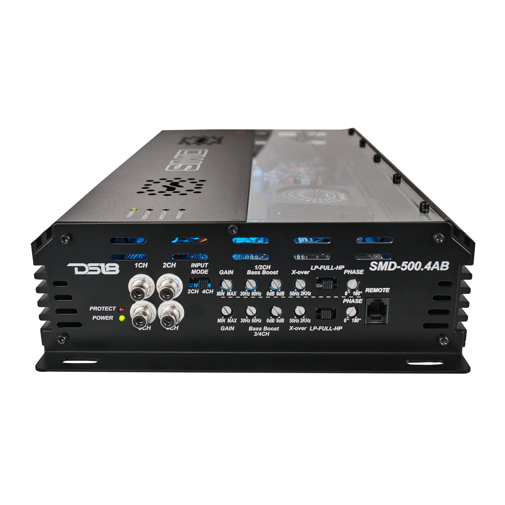 Crafted with precision using only the best components, DS18’s SMD-500.4AB is a full-range amplifier capable of powering anything—from subs and tweeters to midbass vocals and any front and rear combination of speakers. Its advanced protection suite includes thermal overload, DC output, short circuit, and voltage input protection, ensuring safe operation in any setup.